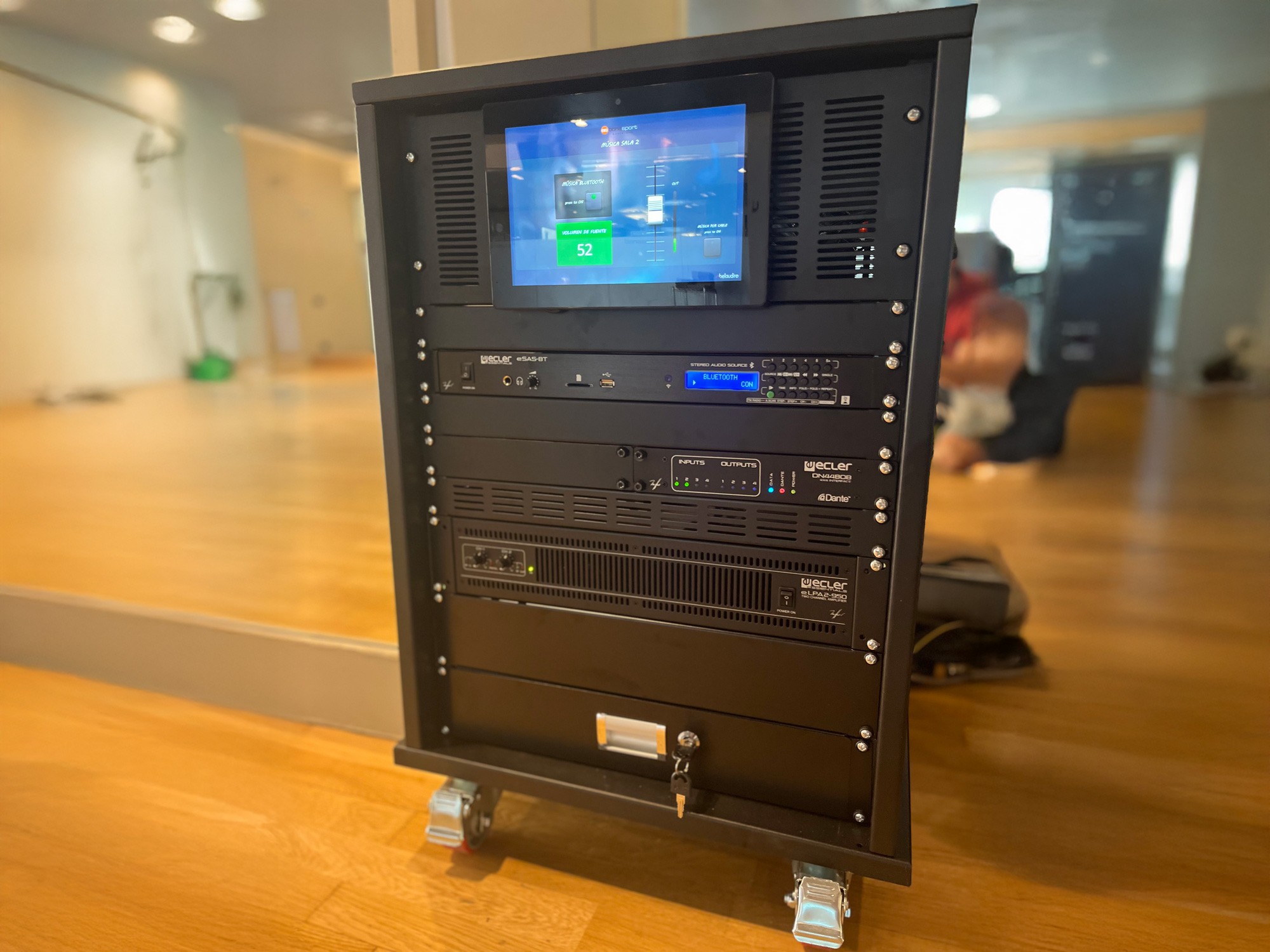 Estos controles permiten seleccionar fuentes como micrófonos, reproductores Bluetooth o el audio de las propias máquinas, además de ajustar los niveles necesarios para cada actividad. El personal trabaja así con una interfaz clara, mientras que el núcleo del sistema permanece protegido, evitando errores y agilizando la operativa diaria.