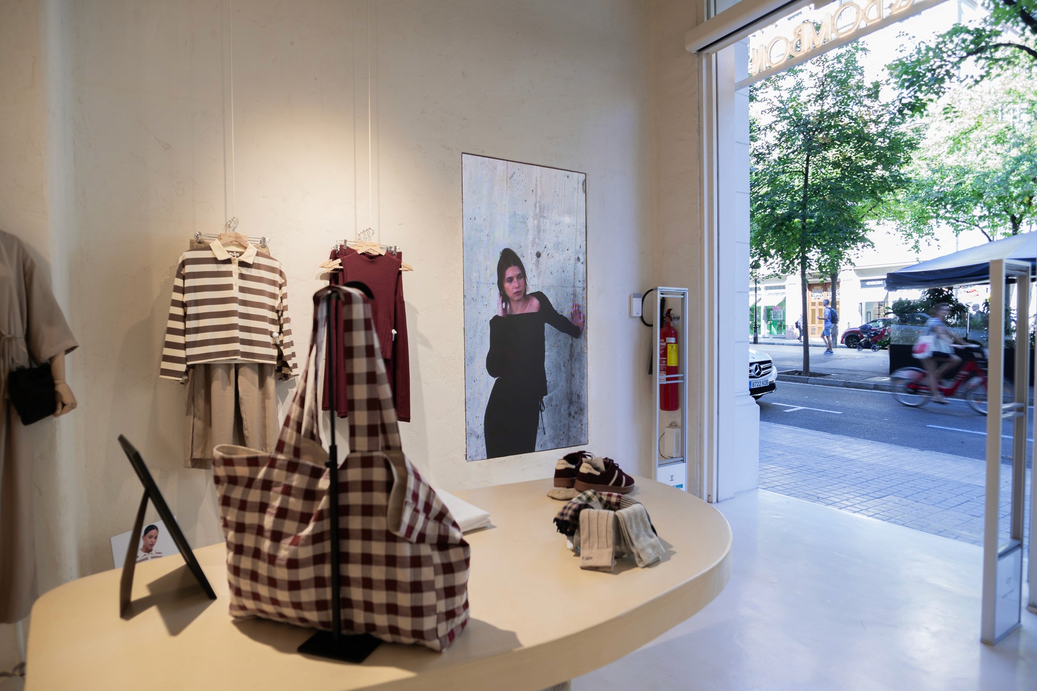 La pantalla LED, instalada en formato vertical junto a la entrada, muestra vídeos de colecciones, campañas y otros contenidos promocionales diseñados para captar la atención desde el exterior.
